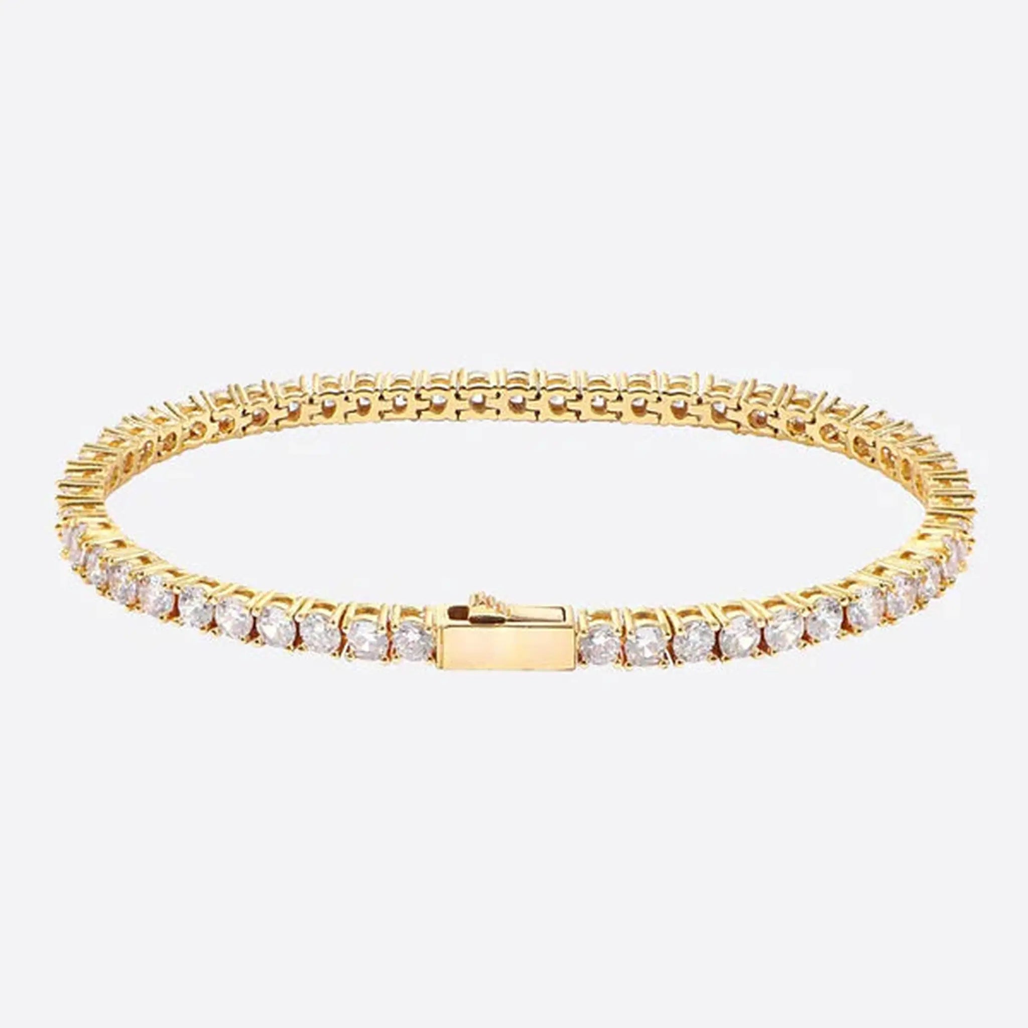 Experience refined elegance with the 3mm Ice and Gold Tennis Bracelet, designed for both men and women. Featuring a line of dazzling simulated diamonds, this bracelet offers a radiant touch that complements any look. Its sleek, minimalist design makes it perfect for daily wear or special occasions, and the high-quality craftsmanship ensures lasting shine and durability.