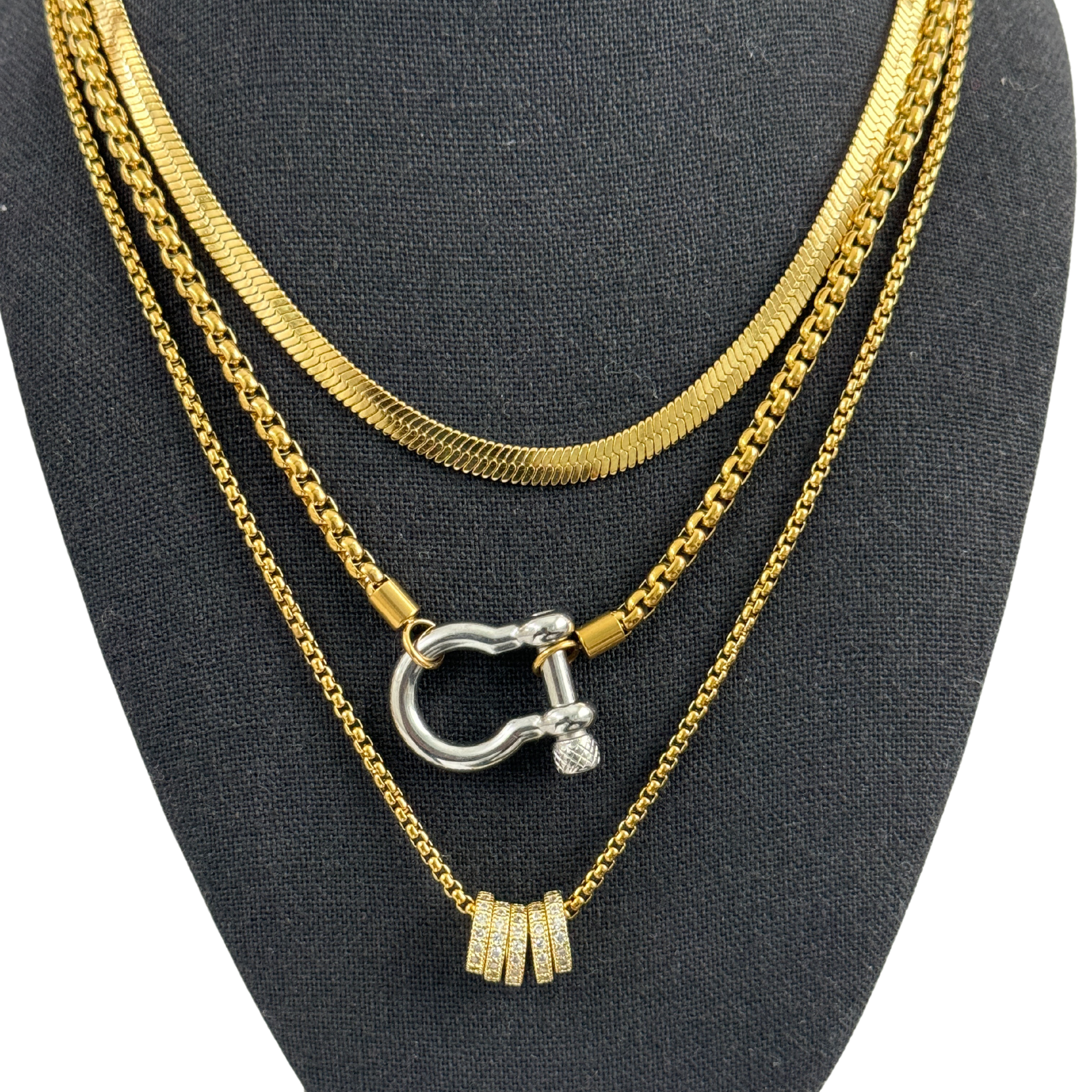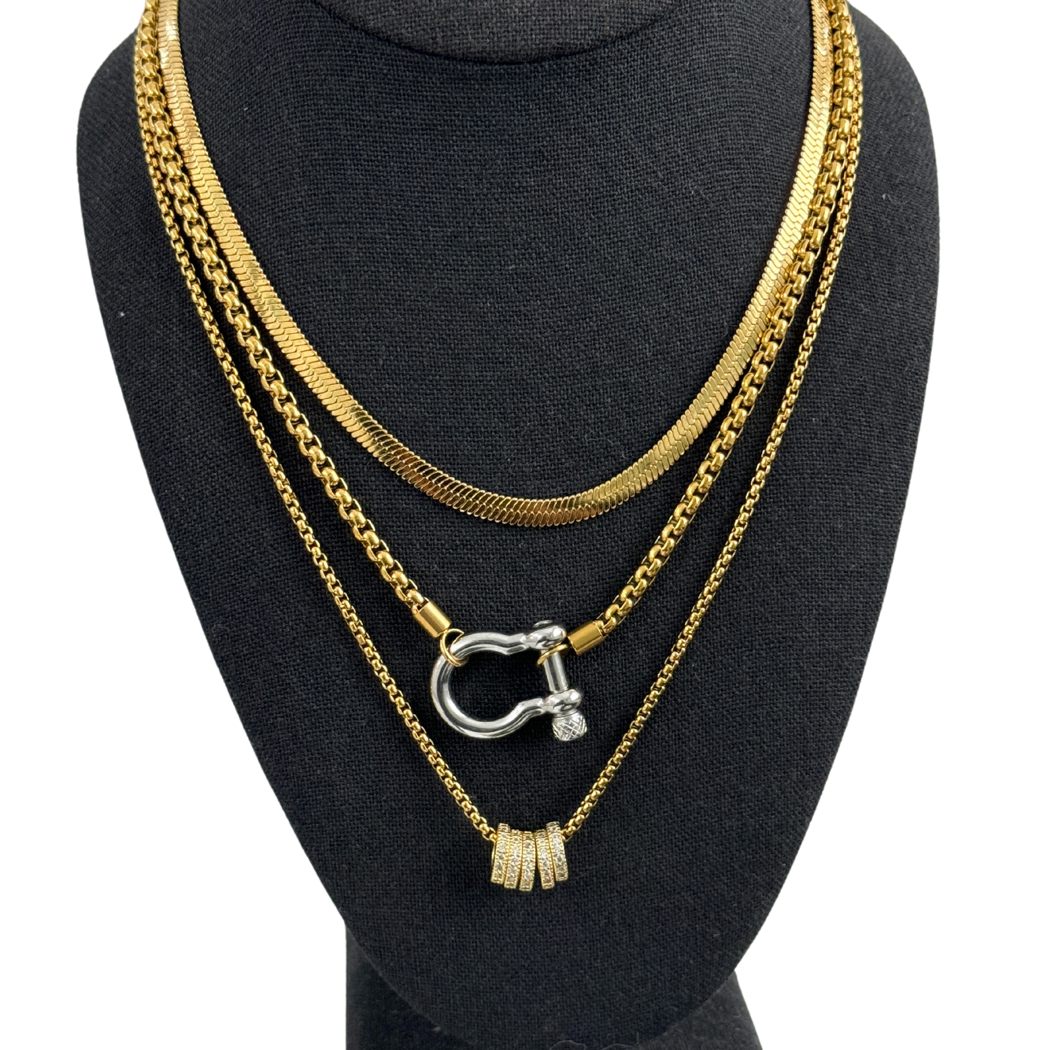 Gold Horseshoe Herringbone and Pave Pendant Necklace Stack