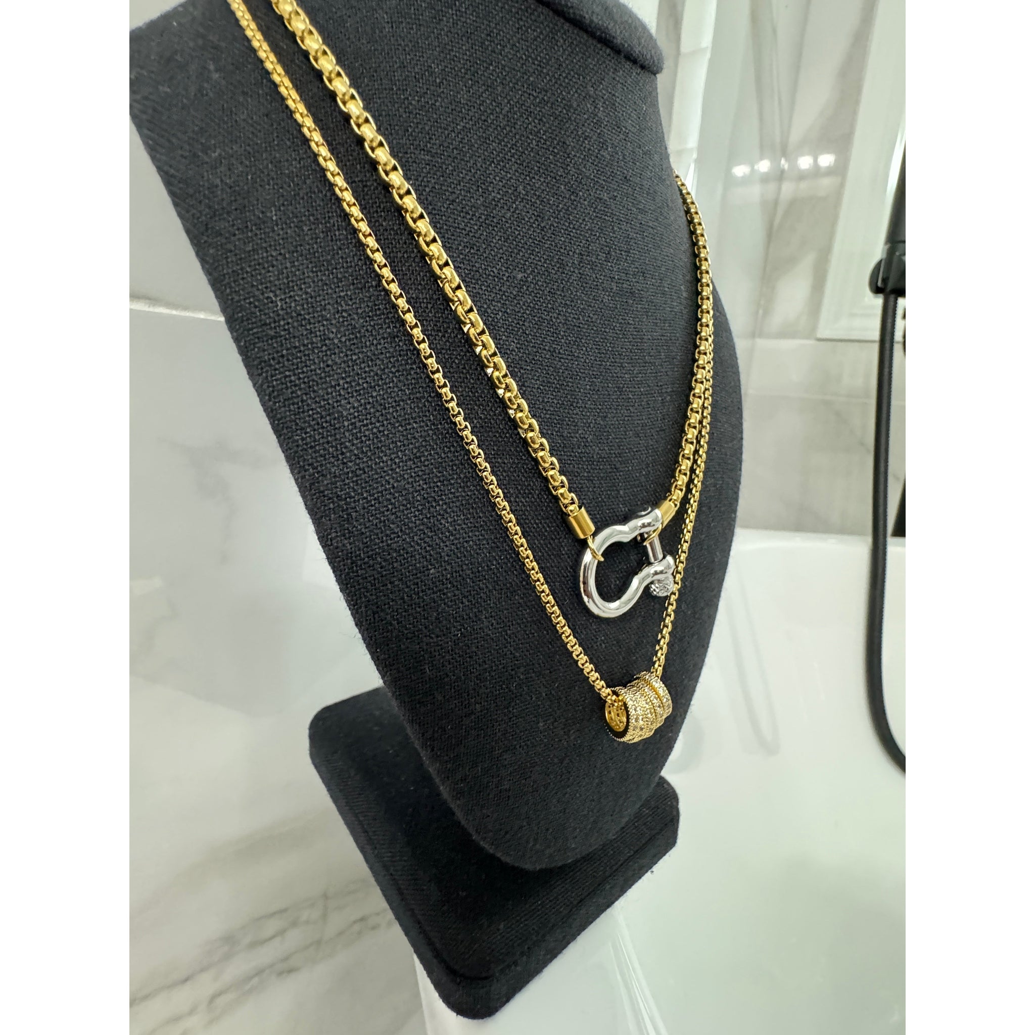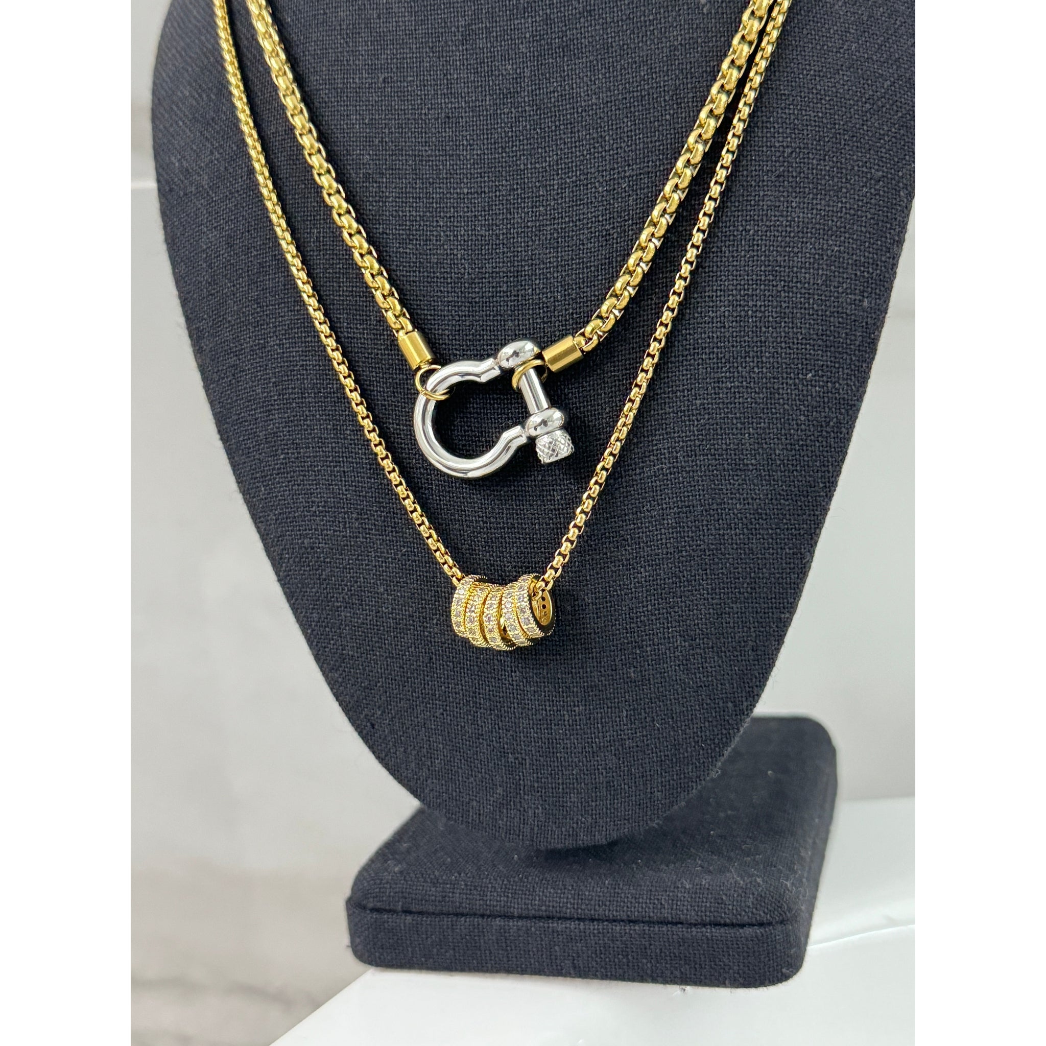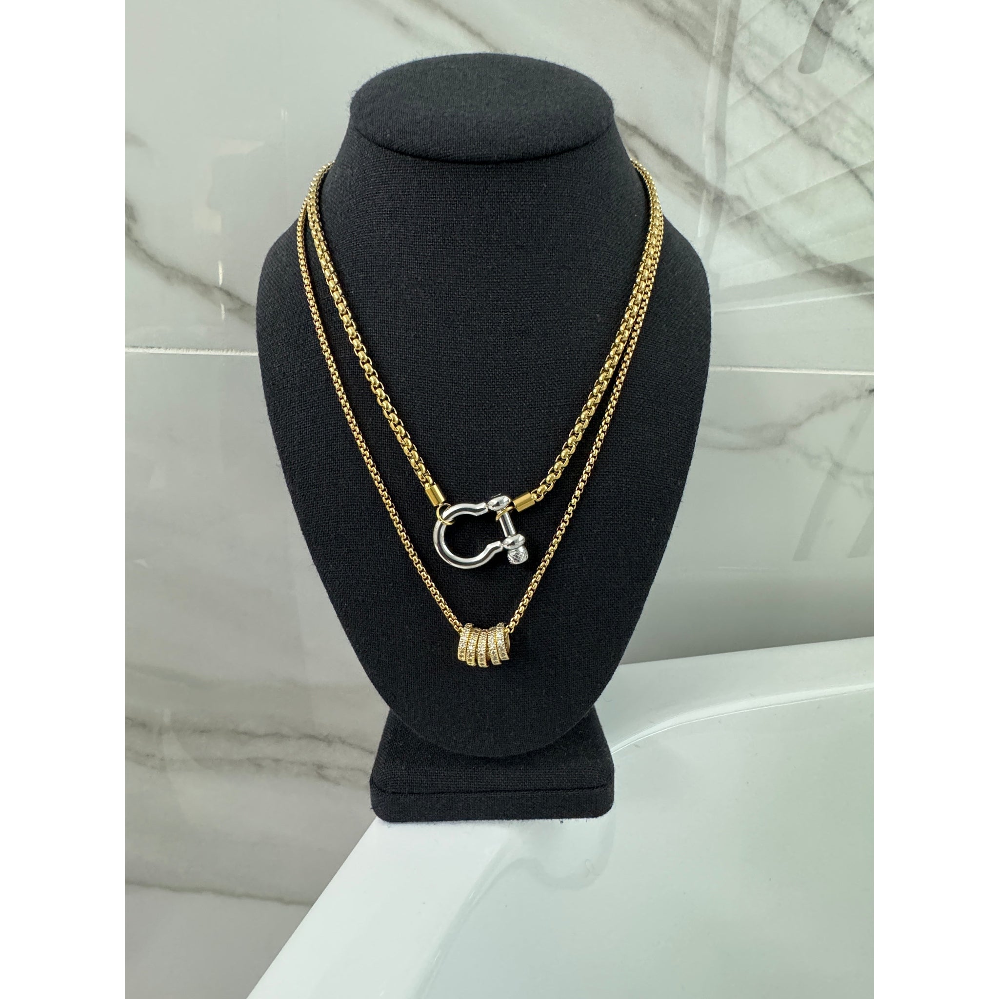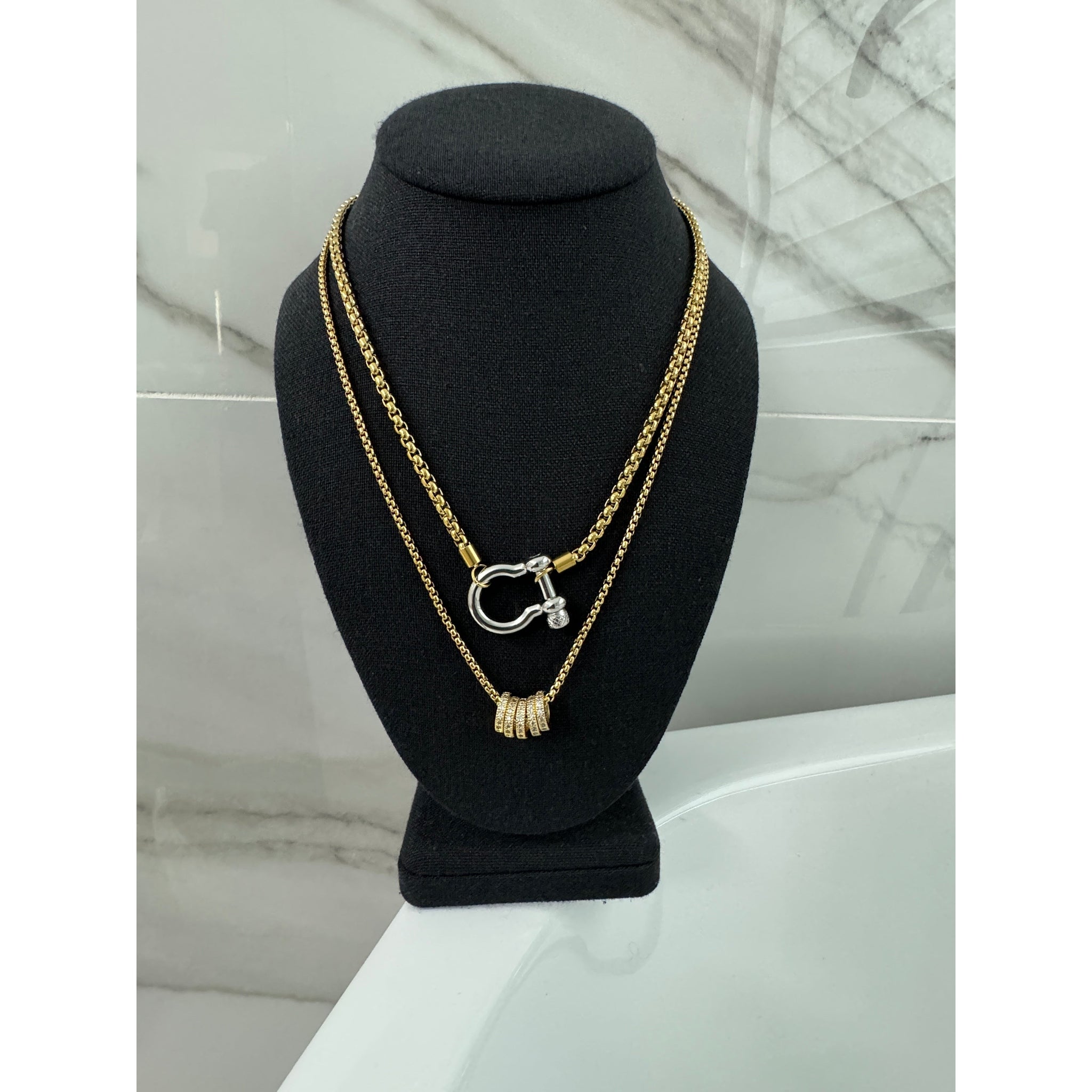 Experience double the luck and style with our Gold Horseshoe and Ring Pendant Necklace Stack. Crafted with a beautiful gold finish, this necklace set features a horseshoe and ring pendant that exudes elegance and charm.