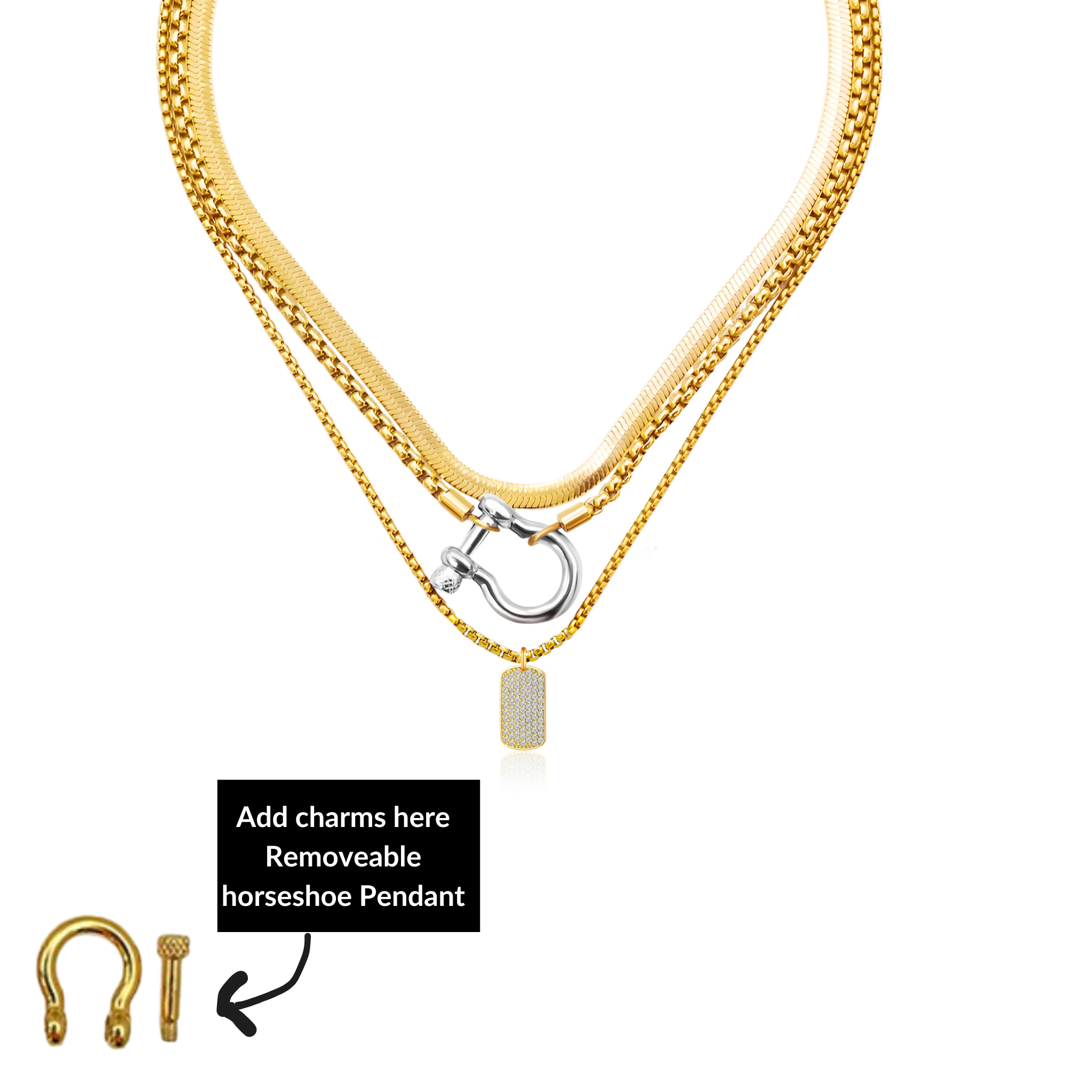 Gold Horseshoe Herringbone and Pave Pendant Necklace Stack