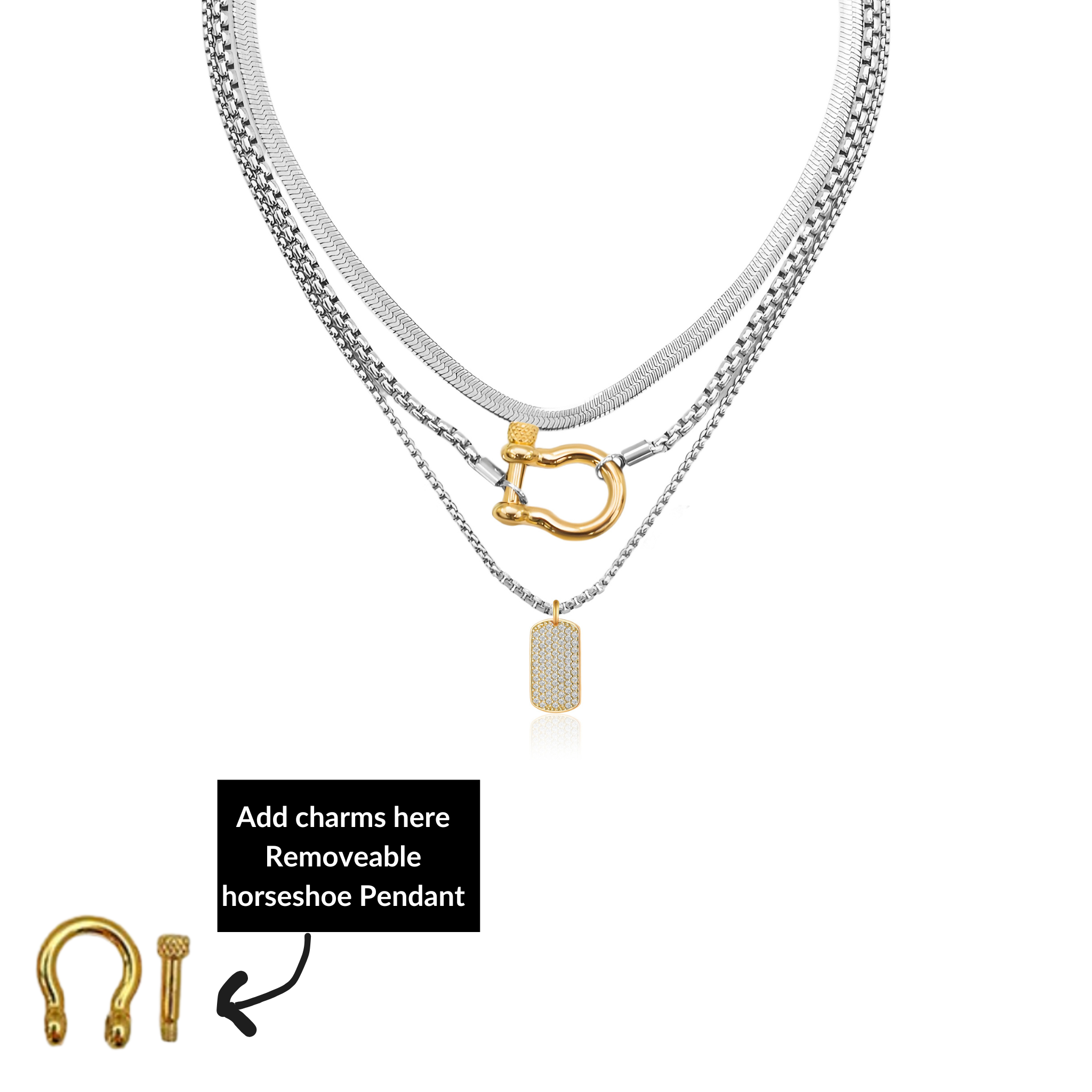 Silver Horseshoe Herringbone and Pave Pendant Necklace Stack