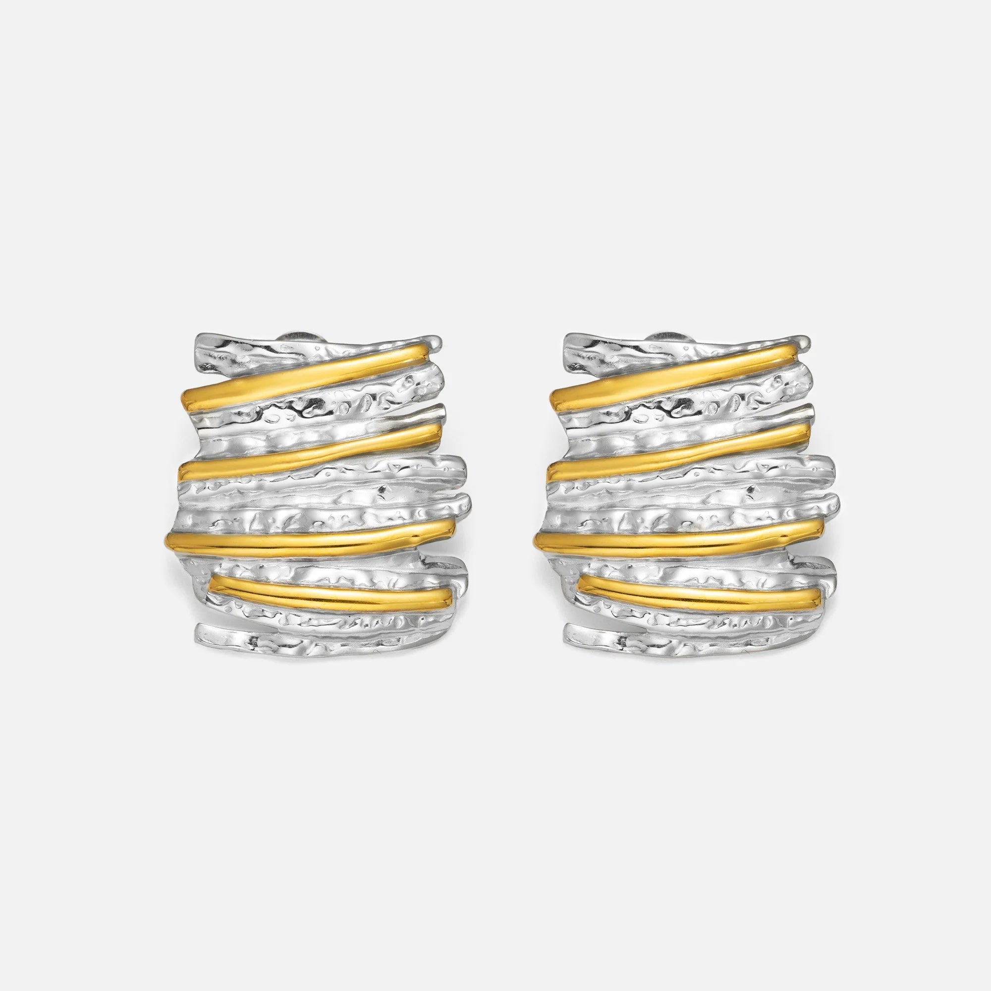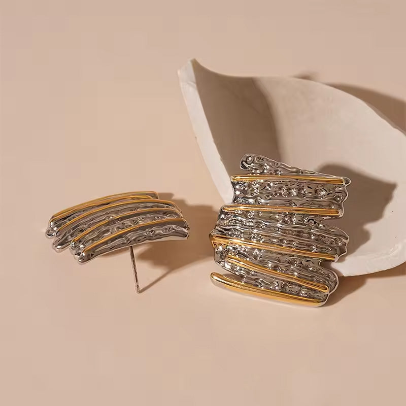 Our Two-Tone Stripe Earrings are a striking blend of gold and white gold tones—perfectly balanced to complement any outfit. The sleek striped design gives them a modern edge, while their ultra-lightweight feel makes them ideal for all-day wear. Whether you're dressing up or keeping it casual, these earrings add just the right amount of shine without weighing you down.