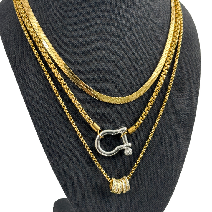 Dare to stand out with our Gold Horseshoe Ring pendant necklace Stack! The perfect accessory for the bold and unique, this necklace stack features stunning horseshoe ring pendants in a shimmering gold finish. Elevate any outfit with this statement piece and let your style shine!